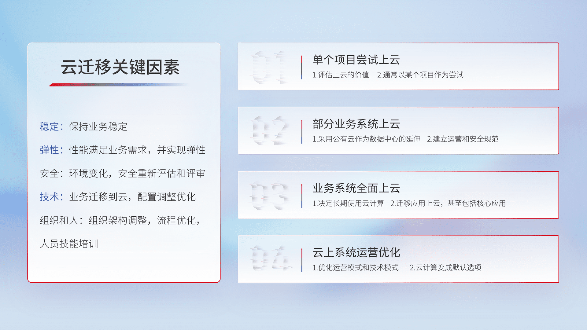 结合实际业务,,,从规划设计、、云平台选型、、、、云原生改造、、、、数据迁移、、、、集成交付,,,迁移全过程为客户识别最佳上云路径,,做好风险识别管理,,,设计网络架构、、身份权限、、、安全审计合规、、、、操作审计、、、日志审计、、、、监控告警策略、、、多站点容灾设计等,,,,对云上基础设施进行整体规划,,,,提升IT治理水平,,以满足弹性、、、、高可用、、、高性能的需求。。。